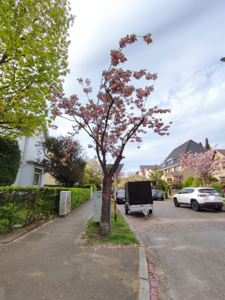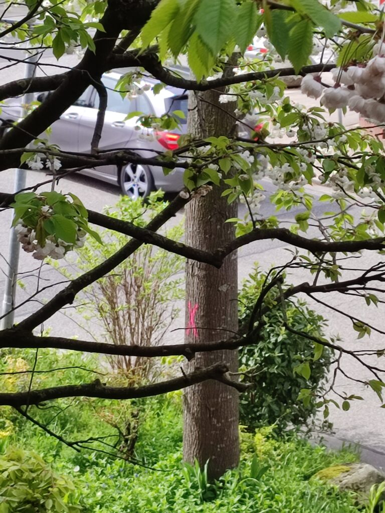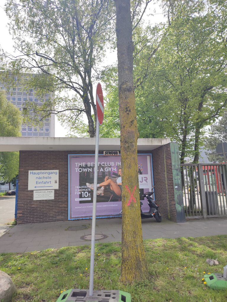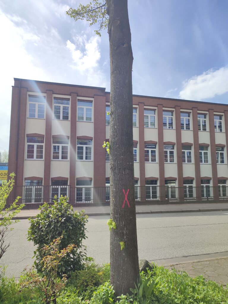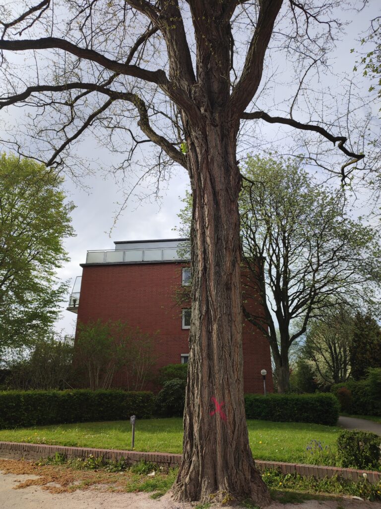 Update 15.5.2023: Heute wurden die markierten Bäume eingerüstet. Eigentlich müsste das beruhigen. Dies tut es wegen der Erfahrungen, die wir im vergangenen Februar machen mussten, leider nicht. Im Februar wurden Bäume auch vorher eingerüstet und danach in einer Hauruck-Aktion gefällt. Was geschieht dieses Mal?