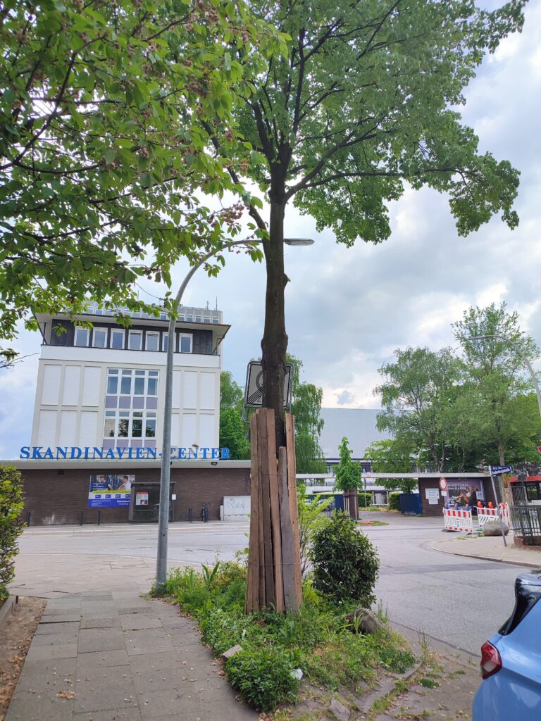 Der NDR und die FDP informierten uns darüber, dass nach deren Kenntnis die rot markierten Bäume zu ihrem Schutze eingerüstet und deshalb nicht gefällt würden. Wollen wir hoffen, dass dies stimmt, denn viele von den Bäumen, die im vergangenen Februar eingerüstet wurden, sind dann doch den Fällungen zum Opfer gefallen.